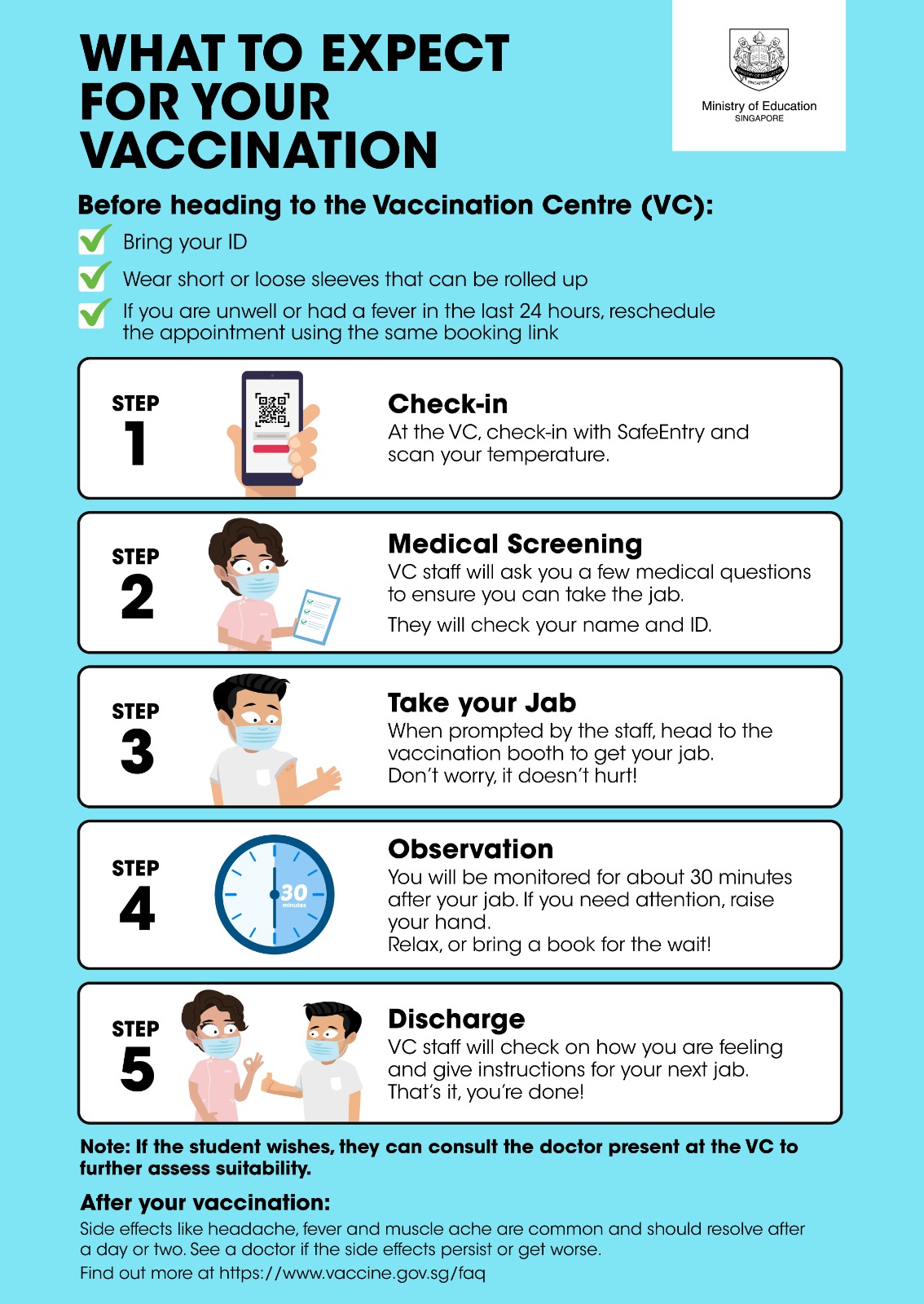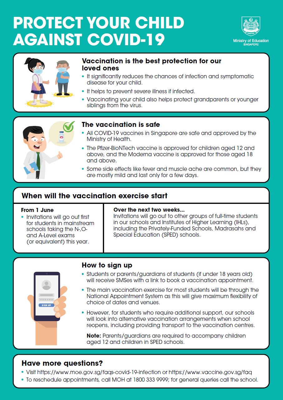 MOE is commencing COVID-19 vaccination for students in schools and Institutes of Higher Learning as part of the national vaccination exercise. From 1 June, parents/guardians of students taking their GCE N-, O- or A-Level examinations this year will receive the SMS invites to schedule students’ vaccination appointments. Parents/guardians of all other eligible students aged 12 and above will receive the SMS invites over the next two weeks. Parental/guardian consent is required for students below the age of 18 when booking vaccination appointments via the National Appointment System. Parents/guardians of students aged 13 and above are not required to accompany their child/ward for the vaccination. While the COVID-19 vaccination is not mandatory, we would like to encourage all medically eligible students to be vaccinated when the vaccine is made available to them and to register for a vaccination slot early. Do consult your child’s/ward’s doctor if your child/ward has underlying medical conditions that might affect their medical eligibility. You may read the attached Parent Kit and Info Sheet or click on the link to the Press Release for more information. MOE will be organising webinars on 1 June (5pm– 6pm) and 3 June (12pm – 1 pm) to address questions you may have regarding the vaccination exercise for students. The webinars will feature an MOH medical expert and MOE representatives. The webinar link is attached below. You may share your questions with us before the webinars via the link to the survey form. Due to the limited capacity of the webinars (3000pax), attendees will be admitted on a first-come first-served basis. Video snippets from the webinar will be uploaded online after the sessions.