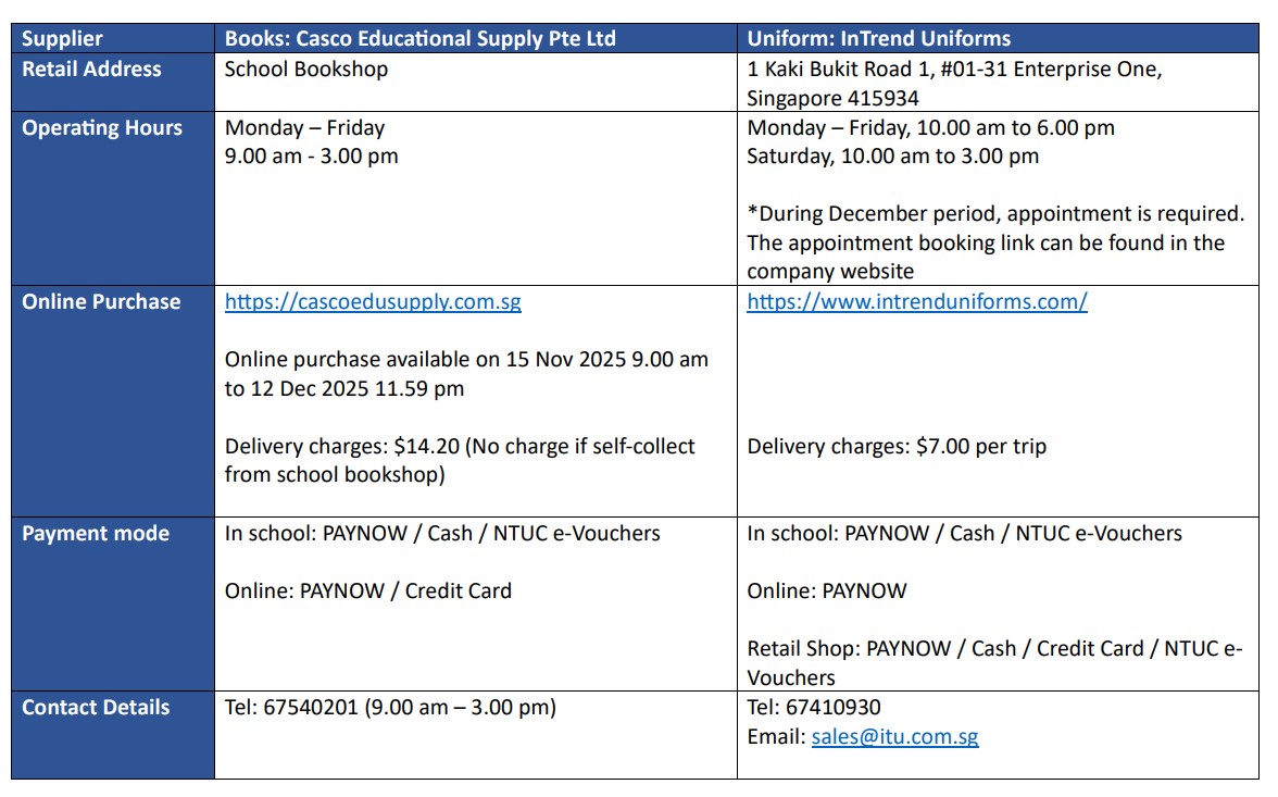 Parents can come in to school between 12pm-3pm on these dates. Parents are not allowed to wait in school after making purchases. Parking is not allowed in the school compound. Please park at the nearest public carpark.